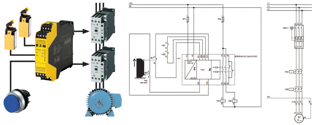 Ví dụ về mạch điện với rơle an toàn ESR5 để giám sát bảo vệ an toàn