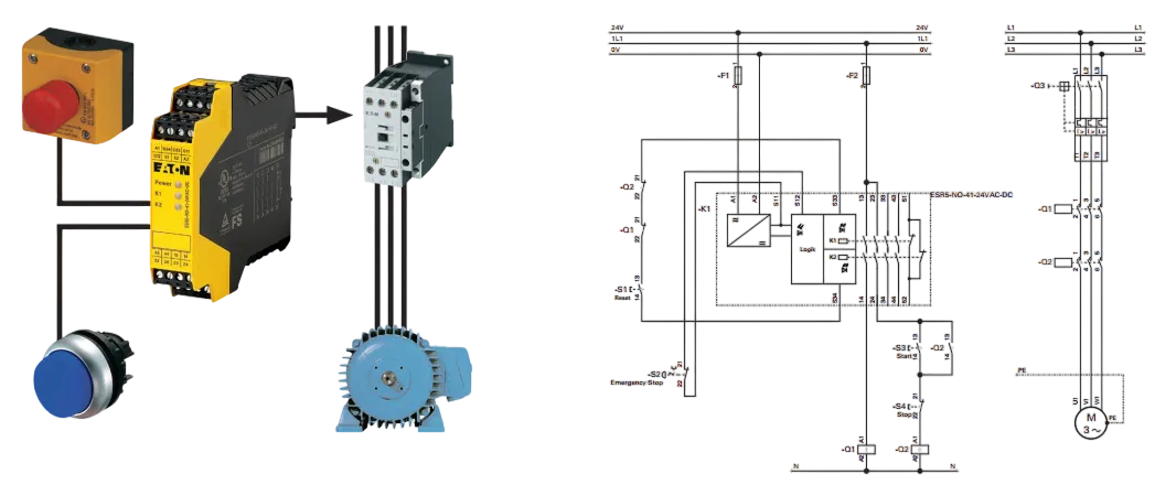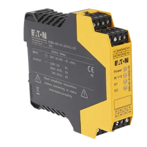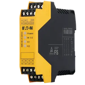Rơ le an toàn điện tử ESR từ công tắc Eaton có nhiều đường dẫn kích hoạt để ngắt nguồn điện ngay lập tức hoặc có thời gian trễ ngay khi nhấn nút DỪNG KHẨN CẤP. Tùy thuộc vào cấu hình, chúng phát hiện các lỗi như đoản mạch, ngắn mạch, hở mạch và cầu nối trong mạch an toàn. Sau khi loại bỏ thành công các mối nguy hiểm/lỗi, rơ le an toàn ESR được xác nhận và các đường dẫn kích hoạt được kích hoạt lại.