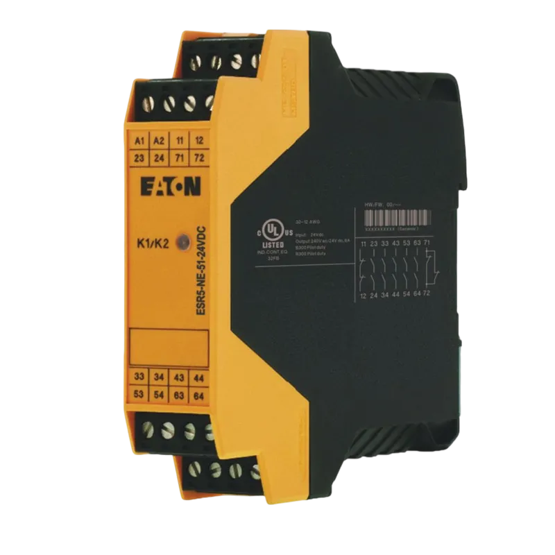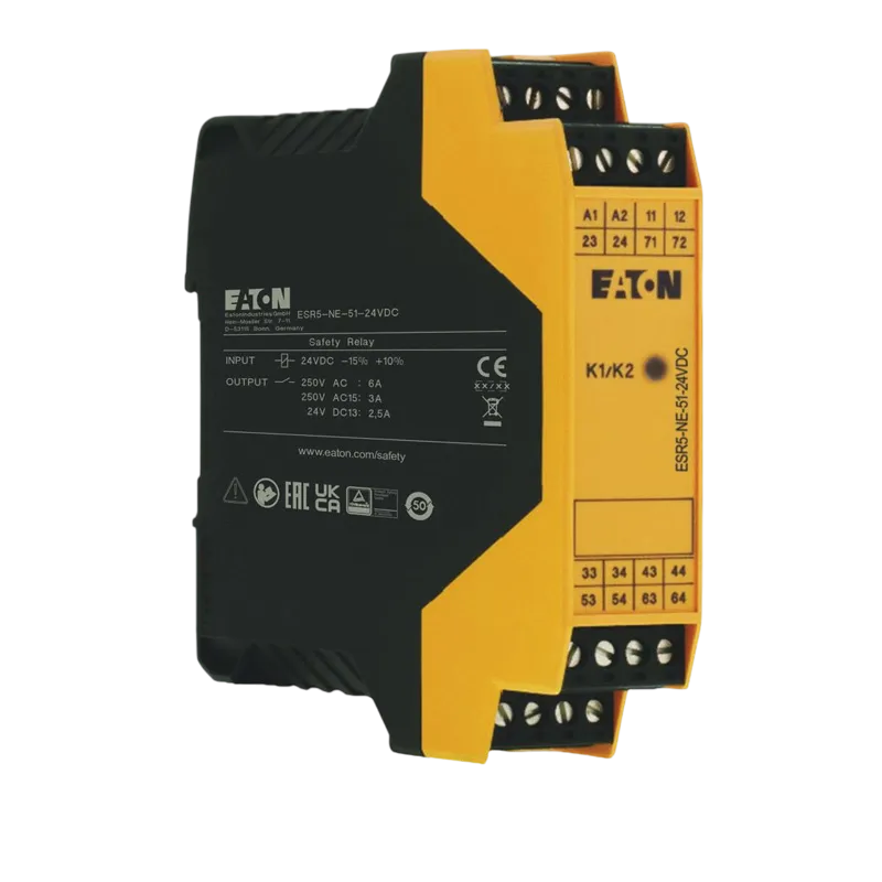 Rơ le an toàn ESR5-NE-51-24VDC từ Eaton cho phép bạn giám sát các mạch dừng khẩn cấp một cách an toàn và hiệu quả. Ngay khi nút DỪNG KHẨN CẤP được nhấn, nhiều đường dẫn kích hoạt sẽ được thiết lập để ngắt nguồn điện ngay lập tức hoặc theo thời gian trễ, tùy thuộc vào cấu hình. Điều này cực kỳ quan trọng trong việc phát hiện lỗi như đoản mạch, ngắn mạch hay hở mạch. Sau khi loại bỏ các nguy cơ/lỗi, rơ le sẽ tự động xác nhận lại và kích hoạt đường dẫn.