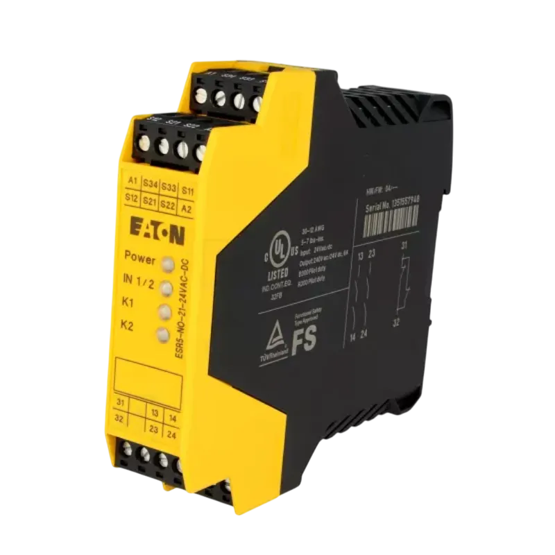 Rơ le an toàn ESR5-NO-21-24VAC-DC từ Eaton cho phép bạn giám sát các mạch dừng khẩn cấp một cách an toàn và hiệu quả. Ngay khi nút DỪNG KHẨN CẤP được nhấn, nhiều đường dẫn kích hoạt sẽ được thiết lập để ngắt nguồn điện ngay lập tức hoặc theo thời gian trễ, tùy thuộc vào cấu hình. Điều này cực kỳ quan trọng trong việc phát hiện lỗi như đoản mạch, ngắn mạch hay hở mạch. Sau khi loại bỏ các nguy cơ/lỗi, rơ le sẽ tự động xác nhận lại và kích hoạt đường dẫn.