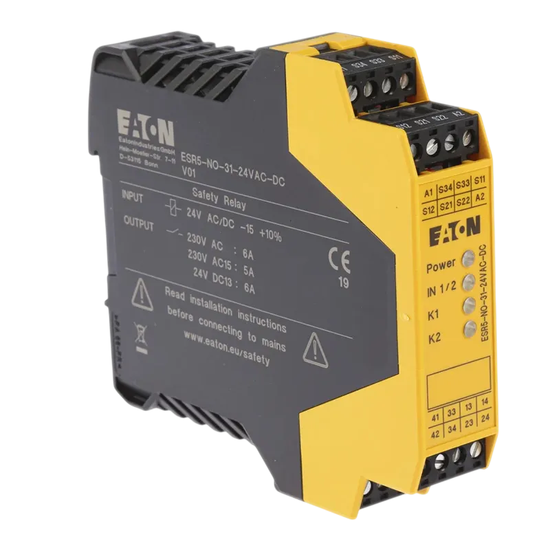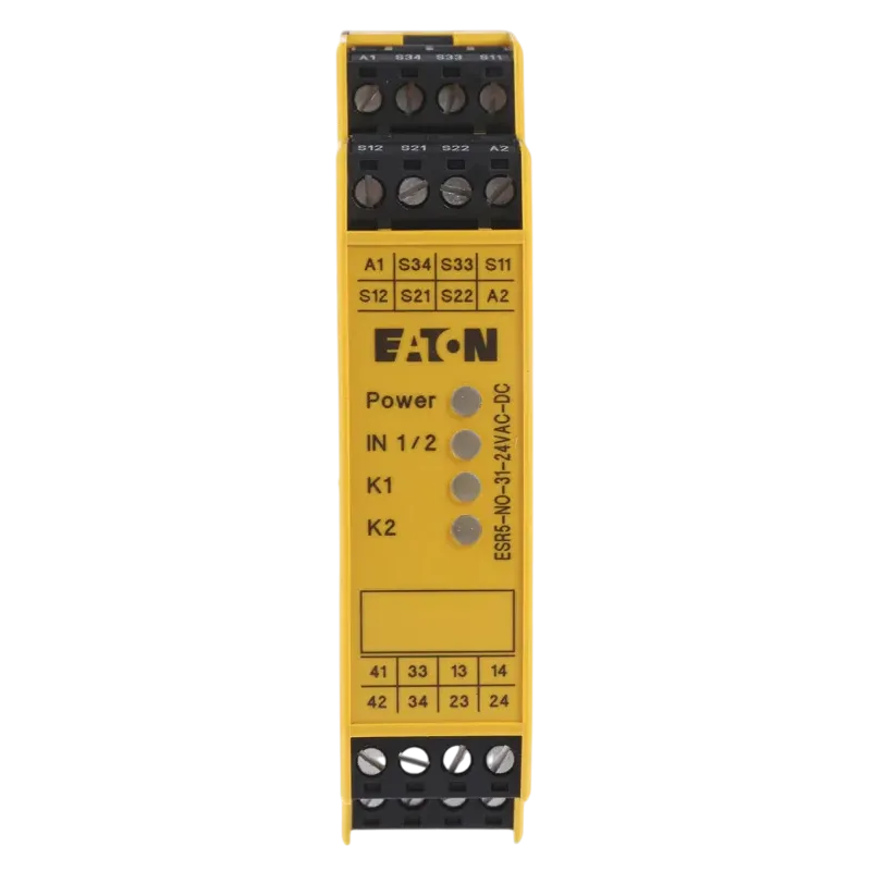 Rơ le an toàn ESR5-NO-31-24VAC-DC từ Eaton cho phép bạn giám sát các mạch dừng khẩn cấp một cách an toàn và hiệu quả. Ngay khi nút DỪNG KHẨN CẤP được nhấn, nhiều đường dẫn kích hoạt sẽ được thiết lập để ngắt nguồn điện ngay lập tức hoặc theo thời gian trễ, tùy thuộc vào cấu hình. Điều này cực kỳ quan trọng trong việc phát hiện lỗi như đoản mạch, ngắn mạch hay hở mạch. Sau khi loại bỏ các nguy cơ/lỗi, rơ le sẽ tự động xác nhận lại và kích hoạt đường dẫn.