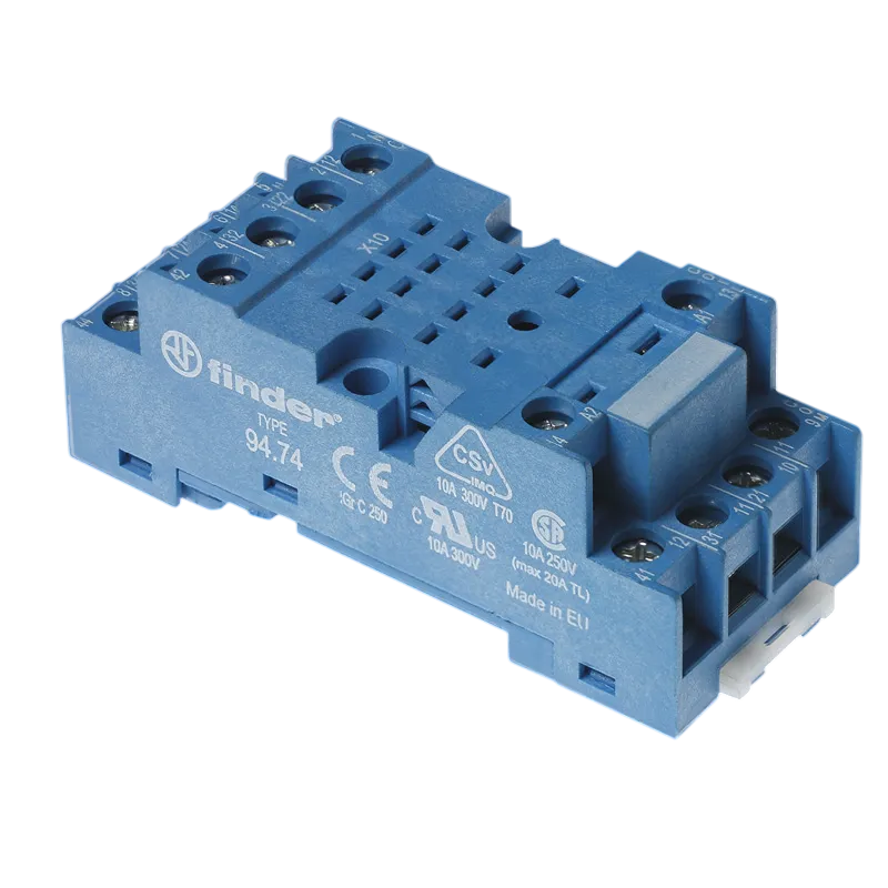 Đế cắm 94.74 đầu nối vít (Kẹp tấm) hoặc giá đỡ thanh ray 35 mm (EN 60715), dành cho rơ le loại 55.32 và 55.34 và bộ hẹn giờ loại 85, loại 85.02 và 85.04.