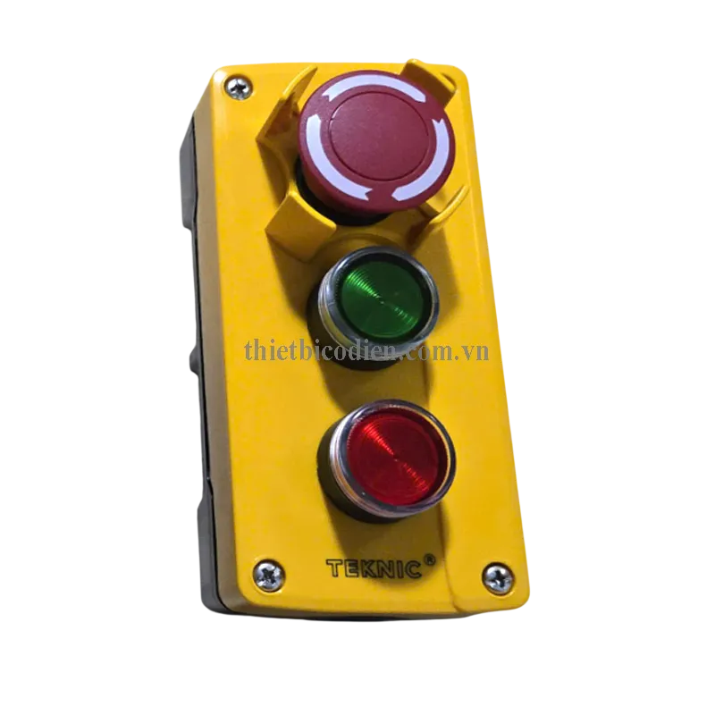 Hộp điều khiển 3 lỗ TEKNIC với mã 4006E10 + EP4PSLF4LB01 + EP4PSLF3LB01 + EP4PSML401 + 2ESS1 (Đèn 220VAC) là sự kết hợp hoàn hảo của nút dừng khẩn Emergency và các nút nhấn nhả có đèn đa dạng: