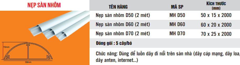 | MH D50 | Nẹp sàn nhôm D50 | 50x15 | 2m | 5 cây/bó |