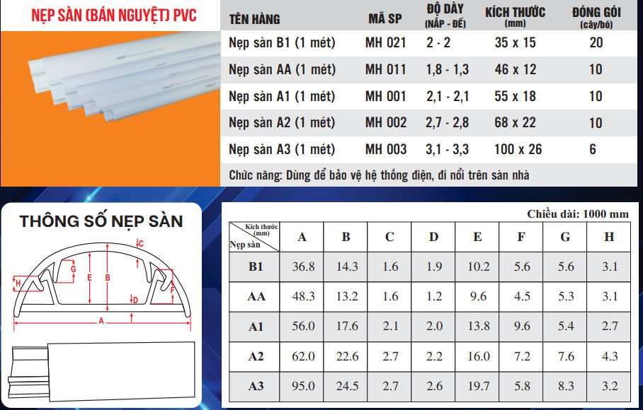 | MH 001 | Nẹp sàn A1 | 55x18 | 1m | 16 cây/thùng |