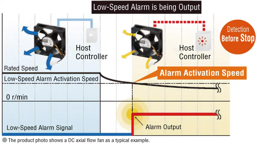 Cảnh báo sẽ được phát ra khi tốc độ quay của quạt giảm xuống dưới tốc độ kích hoạt cảnh báo do tuổi thọ của quạt hoặc bị nhiễm bẩn bởi các hạt lạ. Điều này cho phép bạn sắp xếp và thay thế quạt trước khi quạt ngừng hoạt động. Ngay cả khi công suất làm mát của quạt bị giảm, tác động lên thiết bị vẫn được giảm thiểu, góp phần nâng cao độ tin cậy của thiết bị.