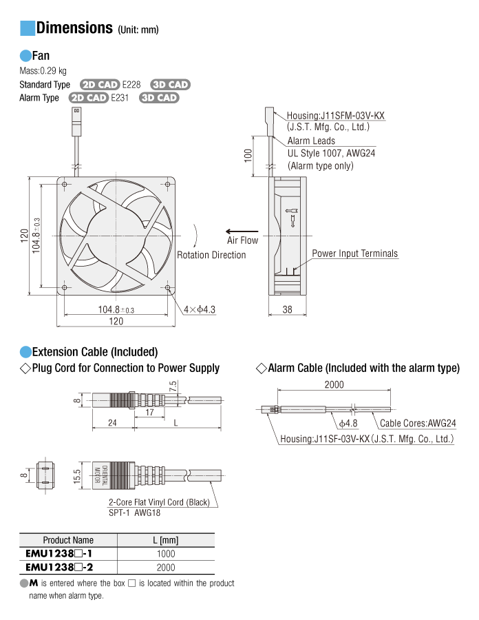 | Mã hàng | Điện áp (V) | Kích thước (mm) | Chức năng bổ sung | Lưu lượng khí tối đa [m3/phút] | Áp suất tĩnh tối đa [Pa] |