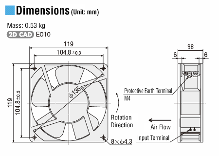 | Mã hàng | Nguồn điện [V] | Kích thước (mm) | Loại tốc độ | Tốc độ quay (r/min) | Lưu lượng khí tối đa [m³/phút] | Áp suất tĩnh tối đa [Pa] |