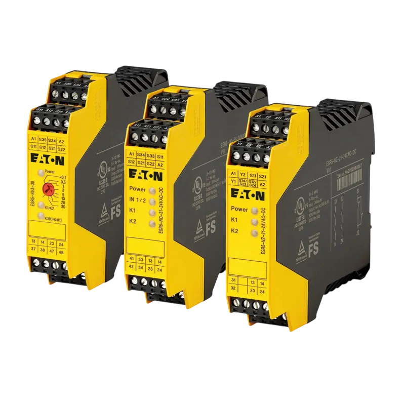 Rơ le an toàn ESR5 từ Eaton cho phép bạn giám sát các mạch dừng khẩn cấp một cách an toàn và hiệu quả. Ngay khi nút DỪNG KHẨN CẤP được nhấn, nhiều đường dẫn kích hoạt sẽ được thiết lập để ngắt nguồn điện ngay lập tức hoặc theo thời gian trễ, tùy thuộc vào cấu hình. Điều này cực kỳ quan trọng trong việc phát hiện lỗi như đoản mạch, ngắn mạch hay hở mạch. Sau khi loại bỏ các nguy cơ/lỗi, rơ le sẽ tự động xác nhận lại và kích hoạt đường dẫn.